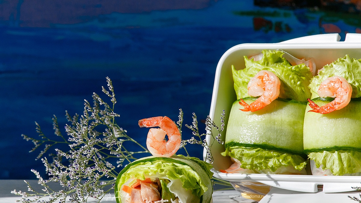 Оживим роллы яркими креветками, сваренными заранее — и готово! В разрезе: огурец, лист салата, рисовая бумага, кальмар, сыр, тунец, авокадо, фунчоза и яркая морковь. - Шаг 18