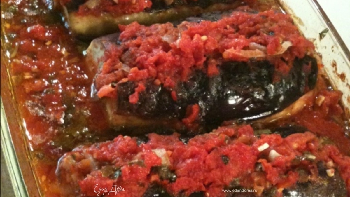 - Шаг 1Помидоры,предварительно,очистить от кожицы и семян.Мякоть мелко порубить.Лук нарезать тонкими полукольцами,чеснок и петрушку мелко измельчить.Обжарить лук в глубокой сковороде или сотейнике на небольшом огне,помешивая,до мягкости,10 мин,добавить чеснок,готовить 1 мин. Затем положить помидоры и петрушку,посолить,перемешать и снять с огня.У баклажанов,при помощи ножа для овощей,снять по 2-3 полоски кожицы шириной 1 см,чтобы он стал полосатым. Прорезать баклажан вдоль по всей длине, но не насквозь.Нафаршировать каждый баклажан получившейся овощной смесью и уложить разрезом вверх в жаропрочную посуду.Отдельно смешать протертую консервированную мякоть томатов, сок лимона, сахар,5-6 ложек оливкового масла и перец.Полить получившимся соусом баклажаны, накрыть форму фольгой.Духовку разогреть до 200 С, выпекать баклажаны 1 час.Подавать блюдо холодным.
