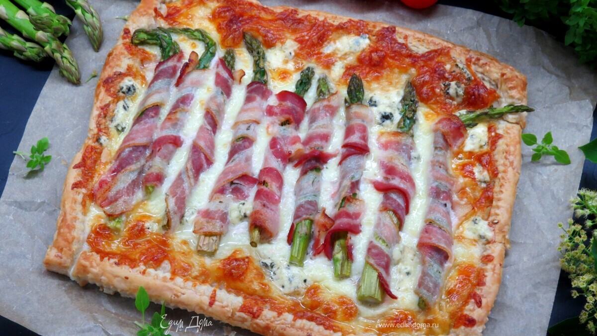 У спаржи отрезать нижнюю твердую часть, обмотать каждый стебель кусочком бекона, равномерно выложить поверх сыра. - Шаг 4