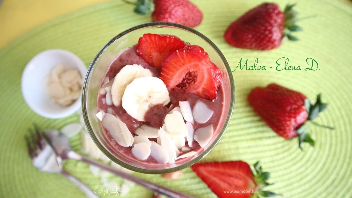 Вылить смузи в стакан, нарезанную на кусочки часть клубники «утопить» в смузи, сверху поместить кружочки банана, миндальные лепестки, пластинки клубники. Приятного аппетита и хорошего дня! - Шаг 6