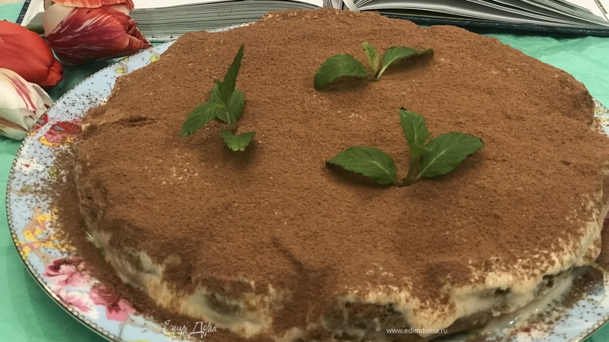 Собираем наш тирамису. Поверх бисквитного печенья выкладываем слой крема из маскарпоне, затем — снова бисквит и снова крем. Ставим тирамису в холодильник на несколько часов. Перед подачей на стол посыпаем какао! Приятного всем аппетита!