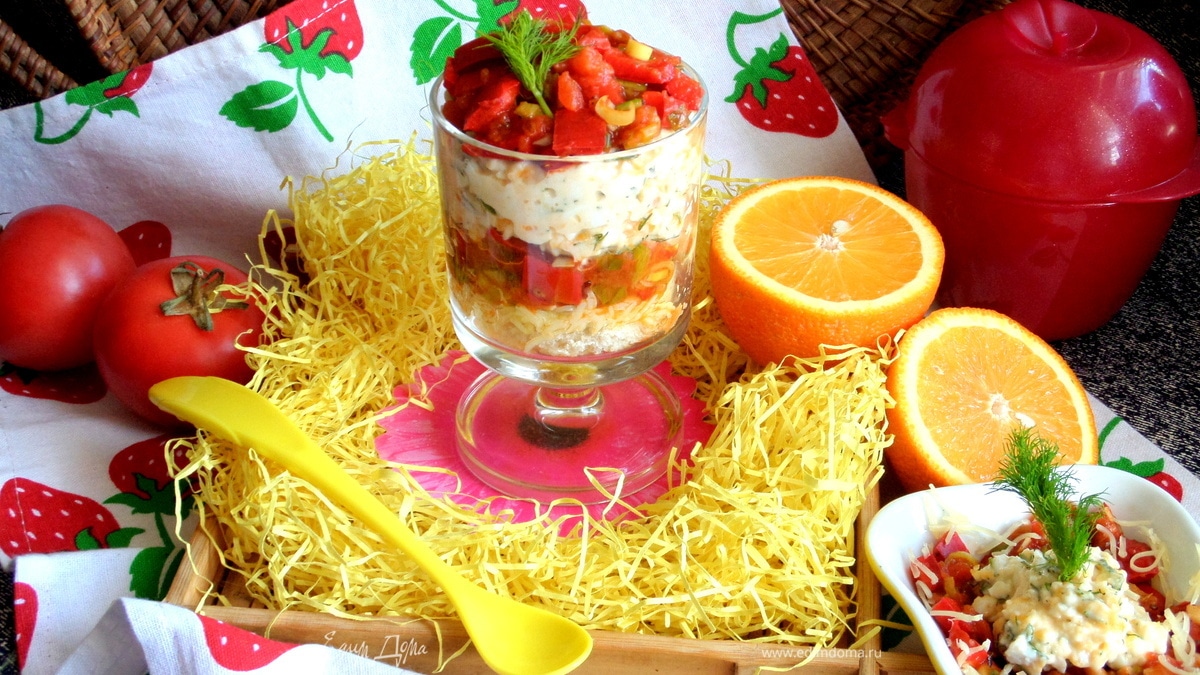 Можно вообще не чередовать слои, а предложить, как в оригинале: яйцо — 1/2 стакана, томаты — 1/2 стакана.