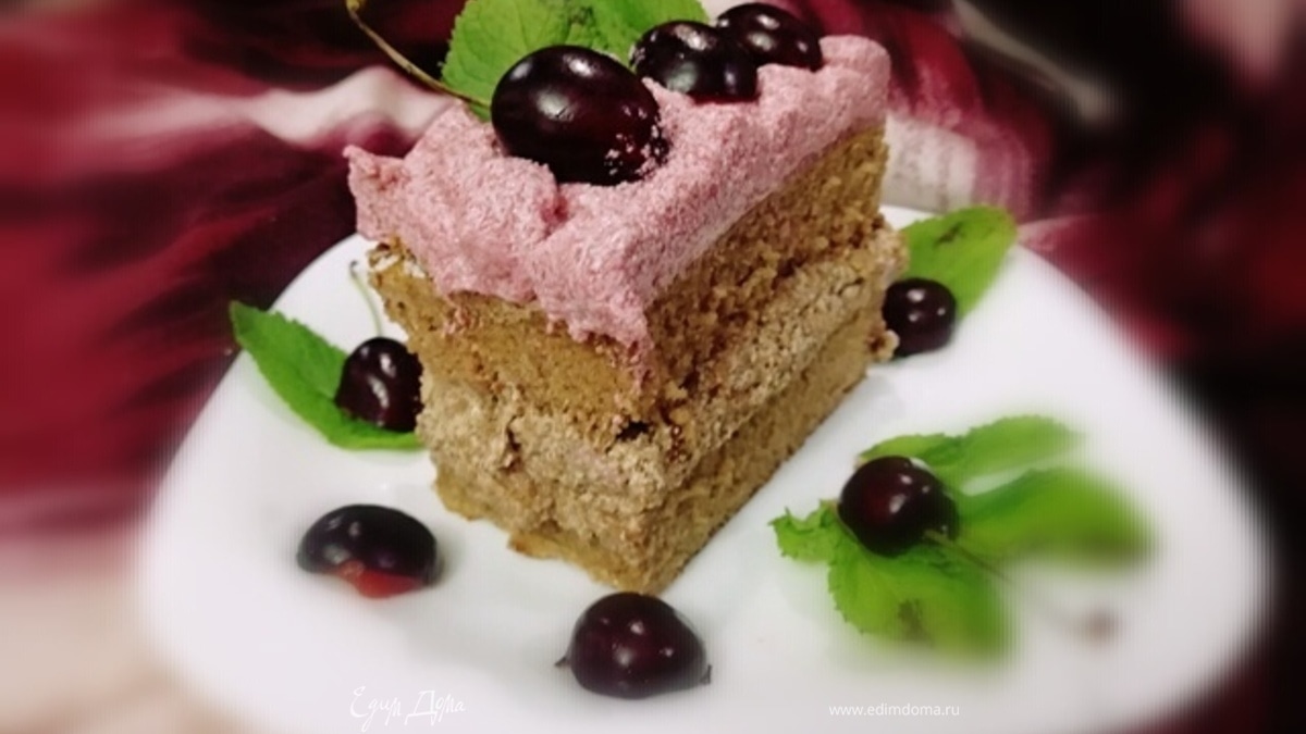 Украшаем торт по желанию. Я украсила половинками черешен без косточек и мятой. Торту надо дать немного постоять и пропитаться. А лучше его кушать на следующий день.