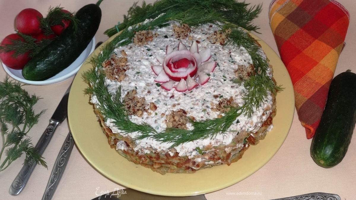 Продолжаю тему любимых и полезных кабачков. На ужин приготовила нежный кабачковый торт. В качестве начинки использовала творог, орехи, зелень и чеснок. Всей семье тортик понравился.