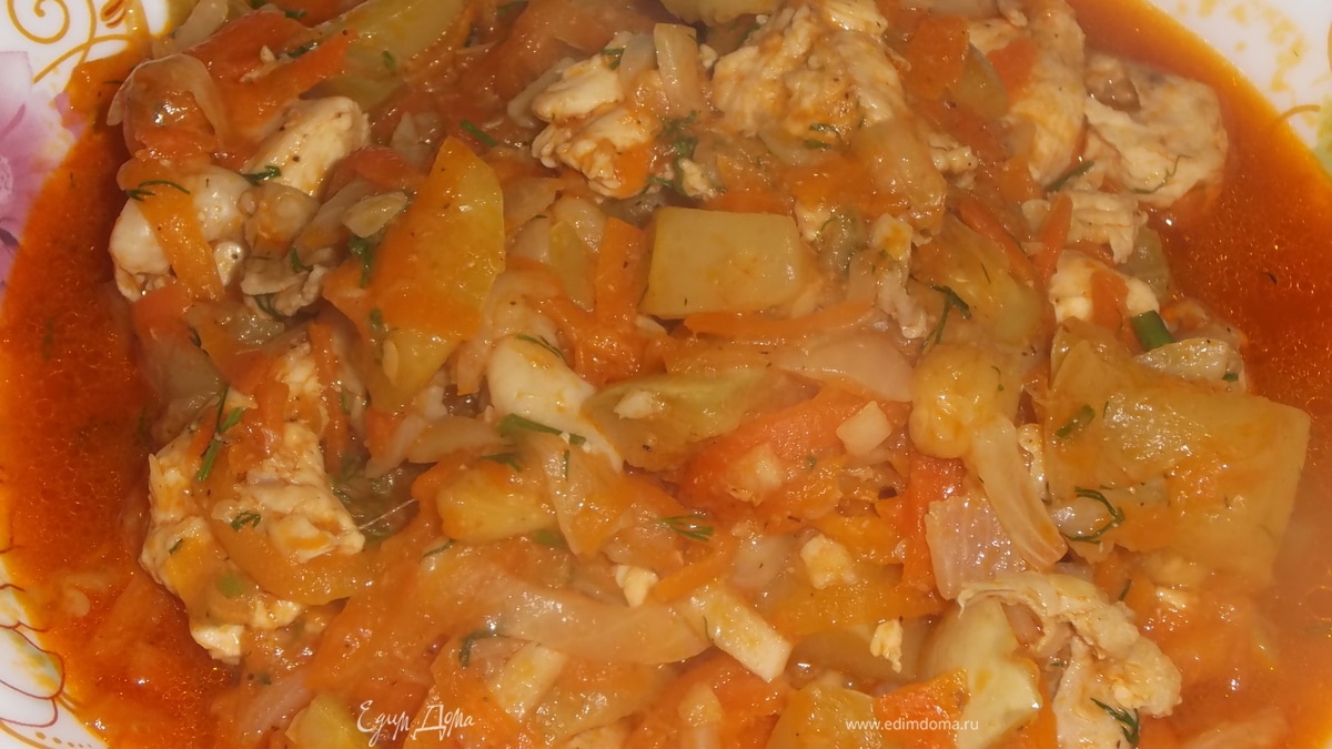Прибавить порезанную куриную грудку. Перемешать, накрыть крышкой, тушить 10 минут на сильном огне. - Шаг 7