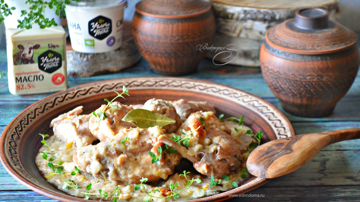 Кролик, топленный в сметане с тимьяном и сливочным маслом