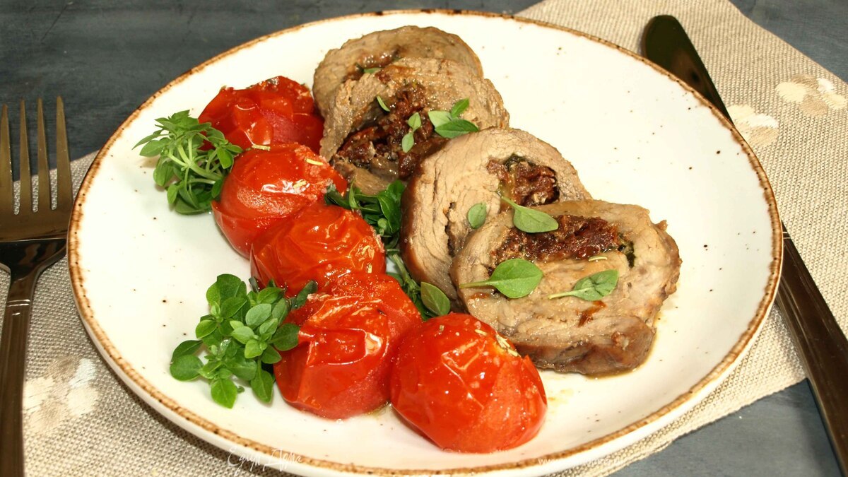 Выкладываем в жаропрочную посуду и отправляем в заранее разогретую до 180ºС духовку на 40 минут или 1 час (зависит от желаемой прожарки). Периодически поливаем рулет выделившимся соком.