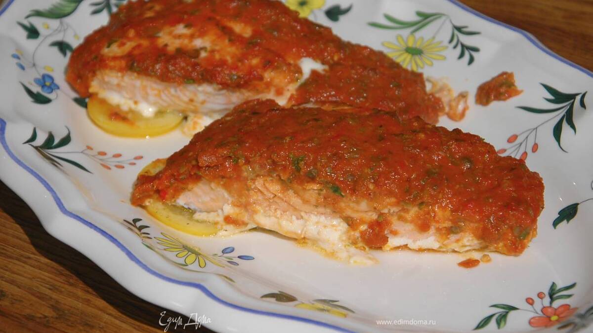 Жаропрочную керамическую форму сбрызнуть оливковым маслом, выложить кружки лимона, сверху поместить семгу и залить все красным песто. - Шаг 7