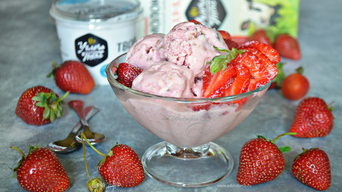 Разложите готовое мороженое по креманкам, украсьте клубникой и наслаждатесь! Вкусного вам лета!