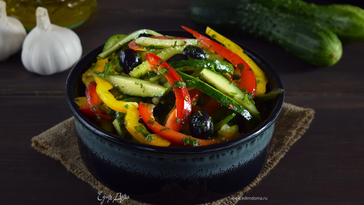 Простой салат из доступных летних овощей с острой заправкой из кинзы. Возьмите перцы разных цветов, и салат получится еще и очень ярким.