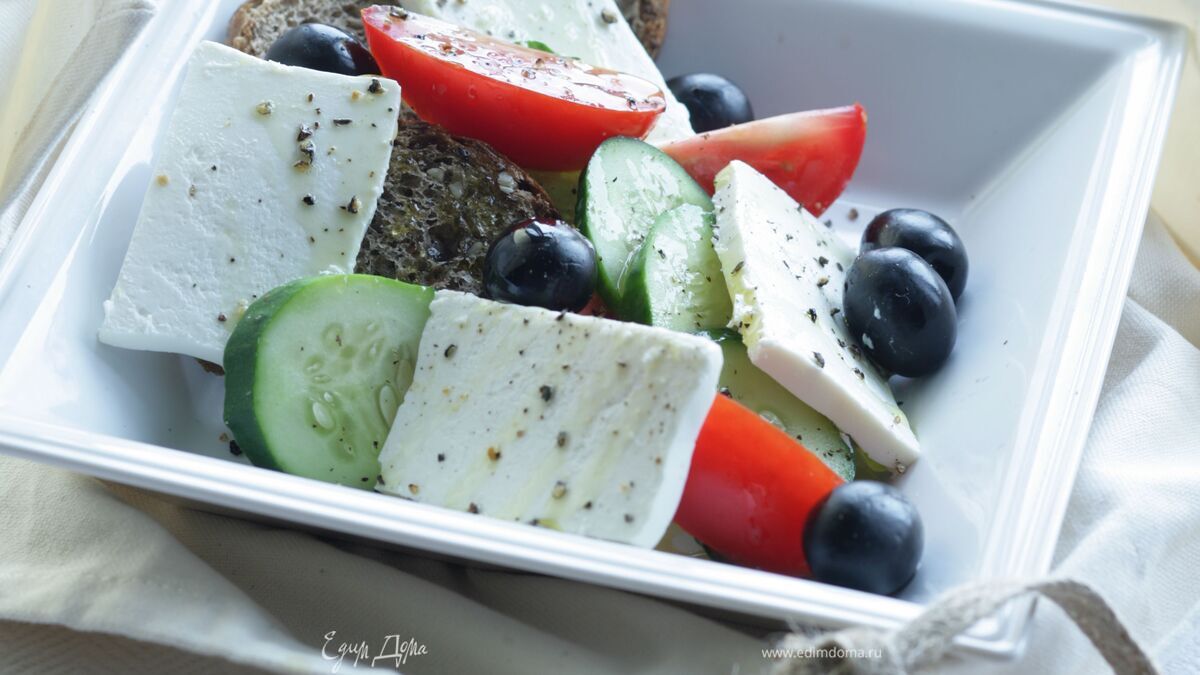 - Шаг 2Разложить помидоры, огурцы, сыр и маслины на 3 тарелки.