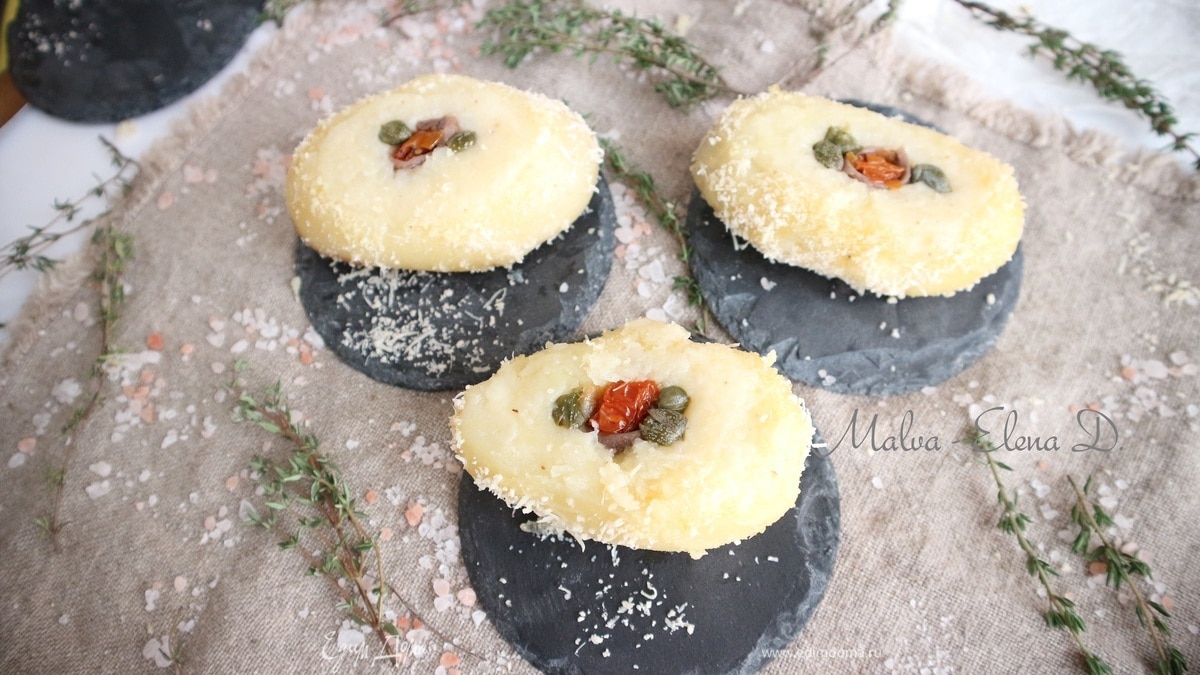 В центр каждой картофелины поместить по одному анчоусу, несколько каперсов и вяленые томаты в масле. - Шаг 10