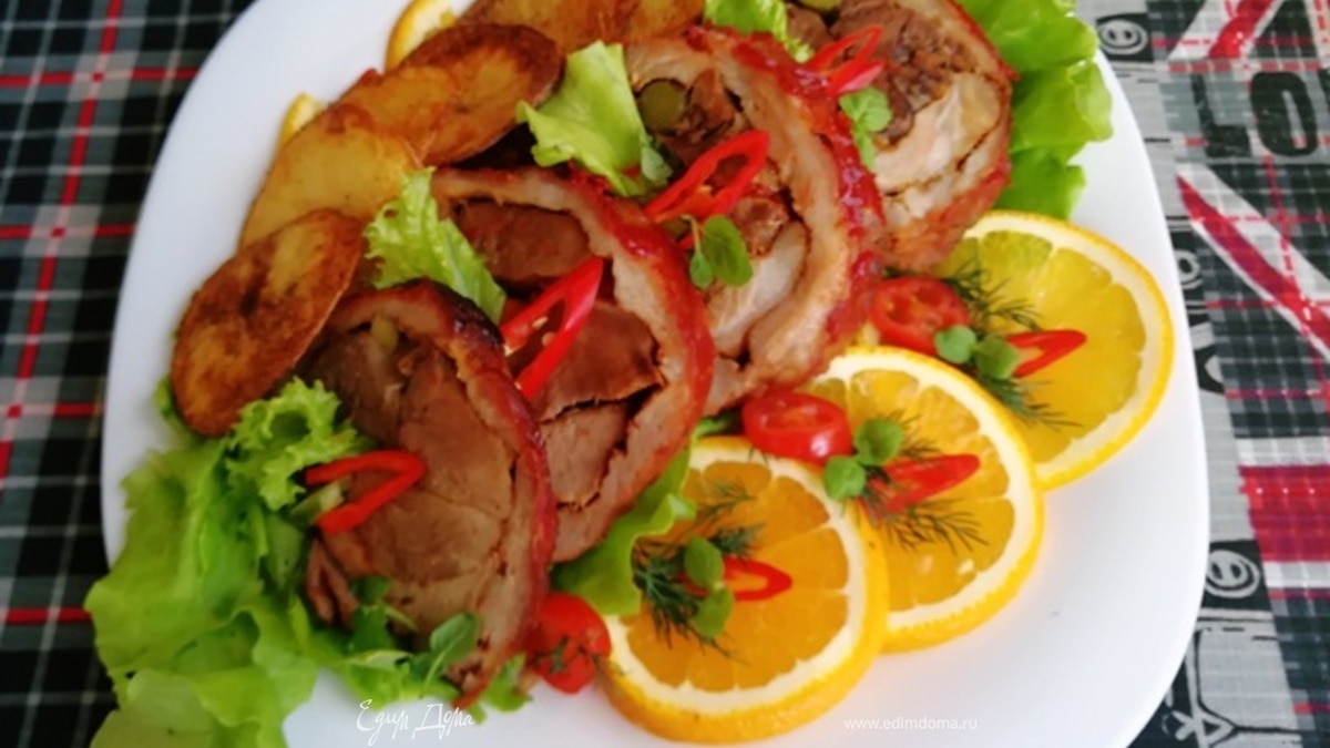 Такой рулет готовится небыстро. Но получается очень вкусным и нежным. Свиная шейка сверху зажаристая, язык свиной просто тает во рту. Блюдо можно подать на праздничный стол или приготовить на выходных.