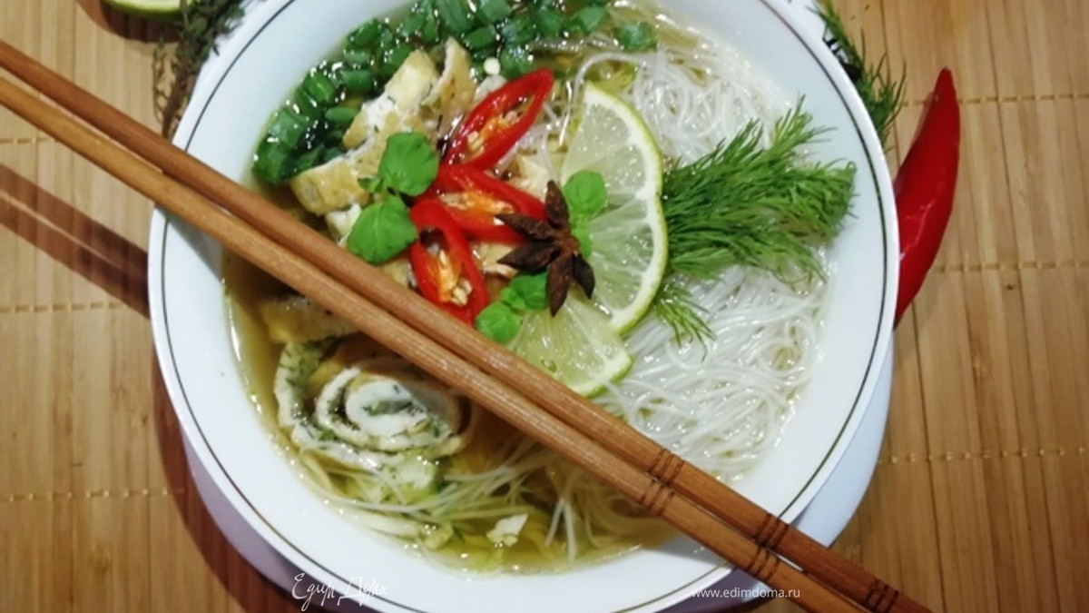 Наливаем остывший бульон, украшаем суп зеленью и дольками лайма, по желанию, перцем чили. Можно подавать! - Шаг 8