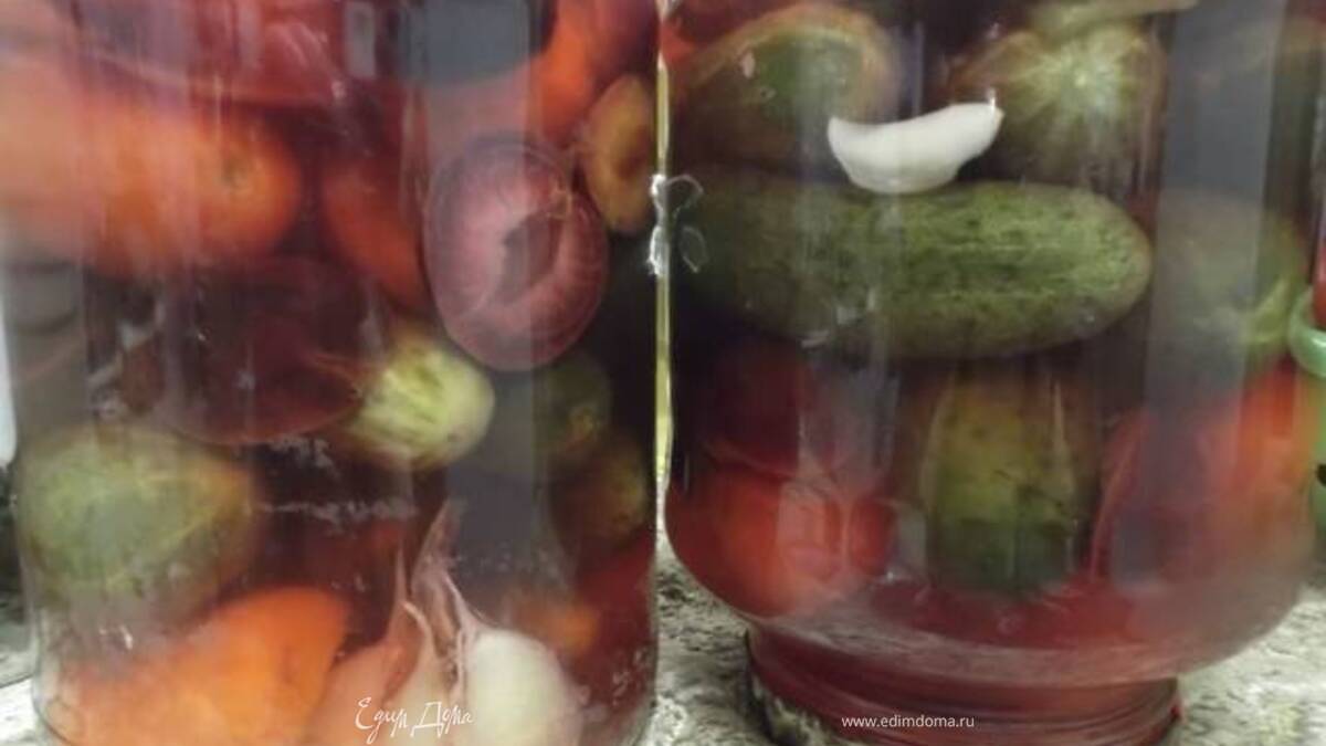 На дно подготовленных банок кладем чеснок и морковь. Уложить слой огурцов, слой слив без косточки, слой помидоров. - Шаг 2