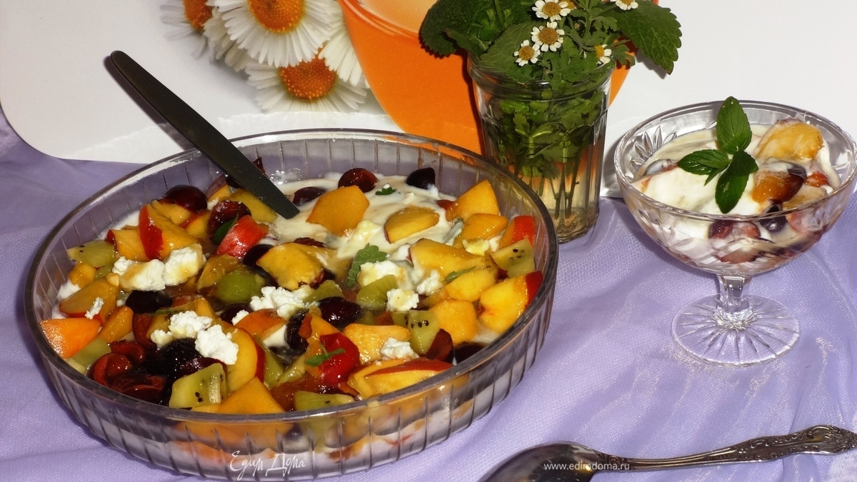 Соединить сметану и мацони, перемешать. Выложить смесь на дно салатника. В сметанную массу выложить все подготовленные фрукты. Сверху положить вразброс маленькие кусочки мягкого сыра. - Шаг 3