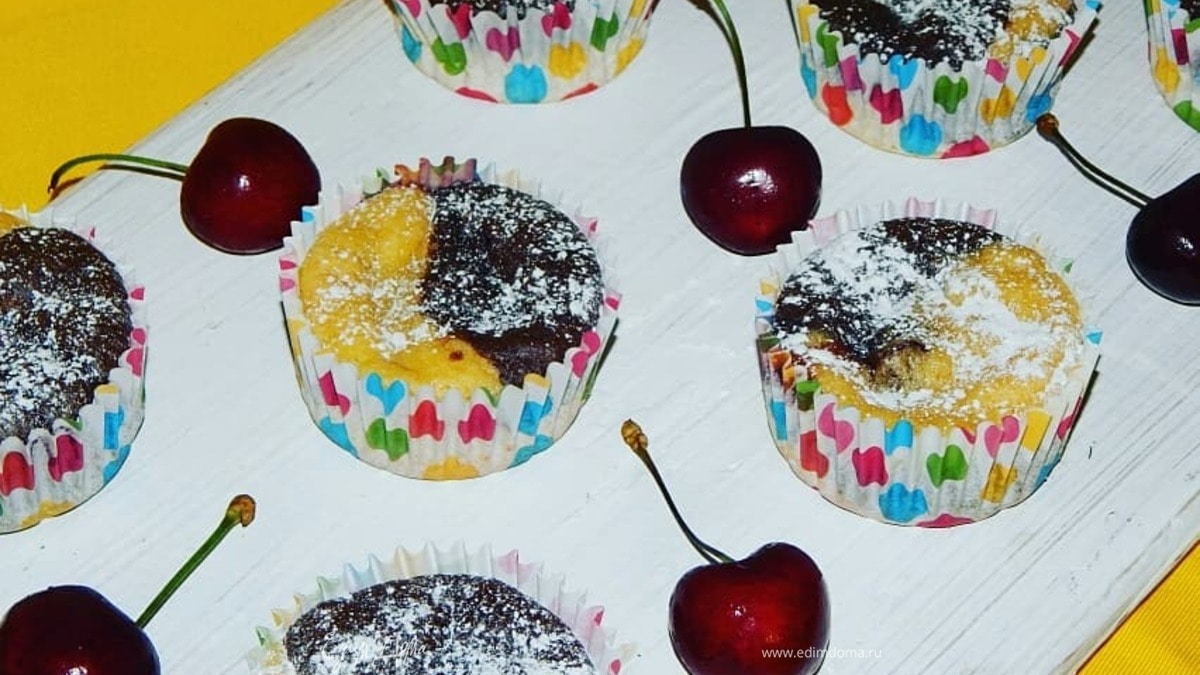 В формы для кексов вложить бумажные капсулы. Выкладываем тесто чайной ложкой, чередуя темное и светлое. В середину положить по одной черешне без косточки. - Шаг 6