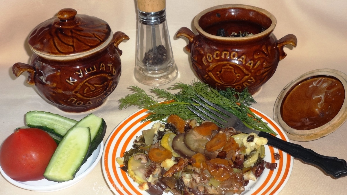 Накрыть горшочки крышками и выставить на противень. Противень с горшками поставить в холодную духовку, нагреть ее до 180°C и от этого времени отсчитать 35–40 мин.
