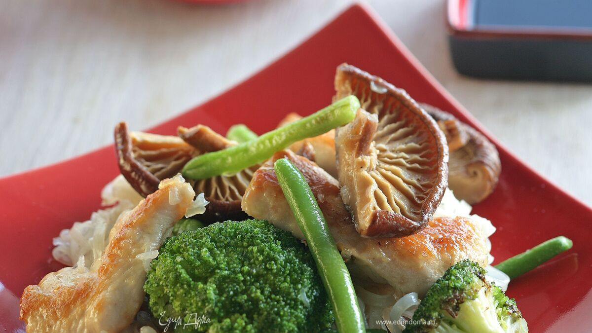 - Шаг 6В той же сковороде обжарить чеснок, брокколи, грибы и лук.