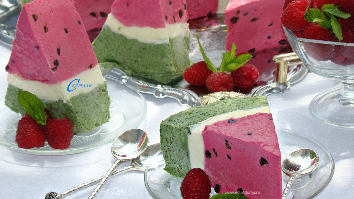 Взбитую сливочную массу разделить пополам, затем одну часть разделить еще на две части в соотношении 1/3. В большую часть добавить шпинатное пюре, маленькую часть оставить белой, а в среднюю часть добавить малиновое пюре, все перемешать до однородности. Все три части поставить в морозильную камеру на 3 часа. - Шаг 10