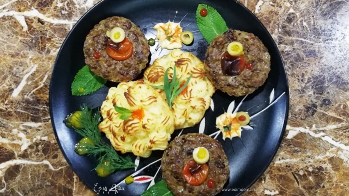 Подаю печеночные котлеты с картофелем дюшес, украсив веточками мяты, укропом, оливками и соусом из манго. - Шаг 5