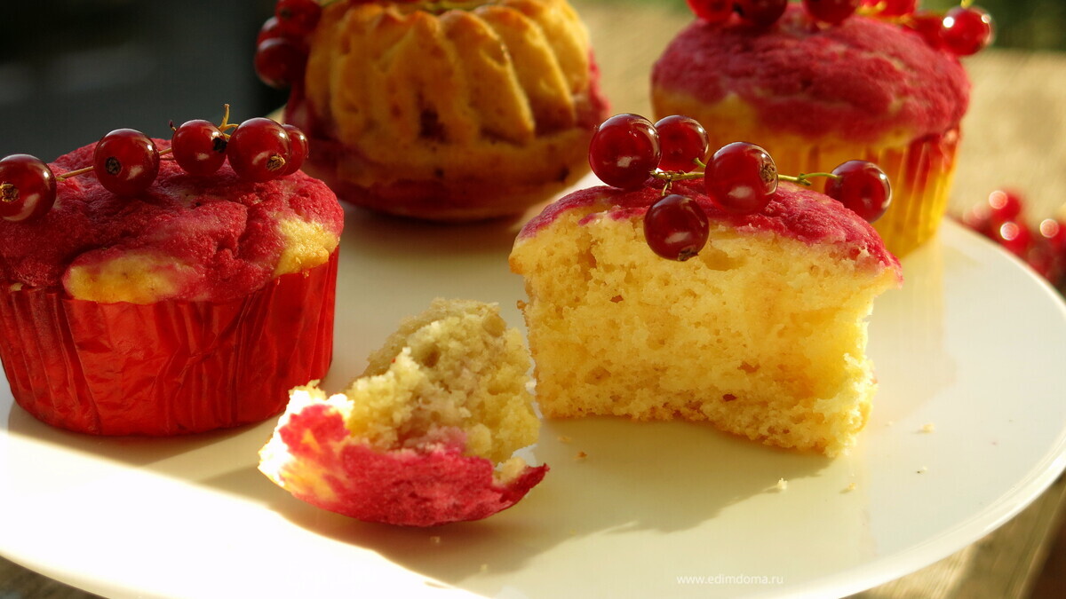 Попробуйте мягчайшие маффины на рикотте с заливкой из свежей красной смородины. Ягодная заливка дает
