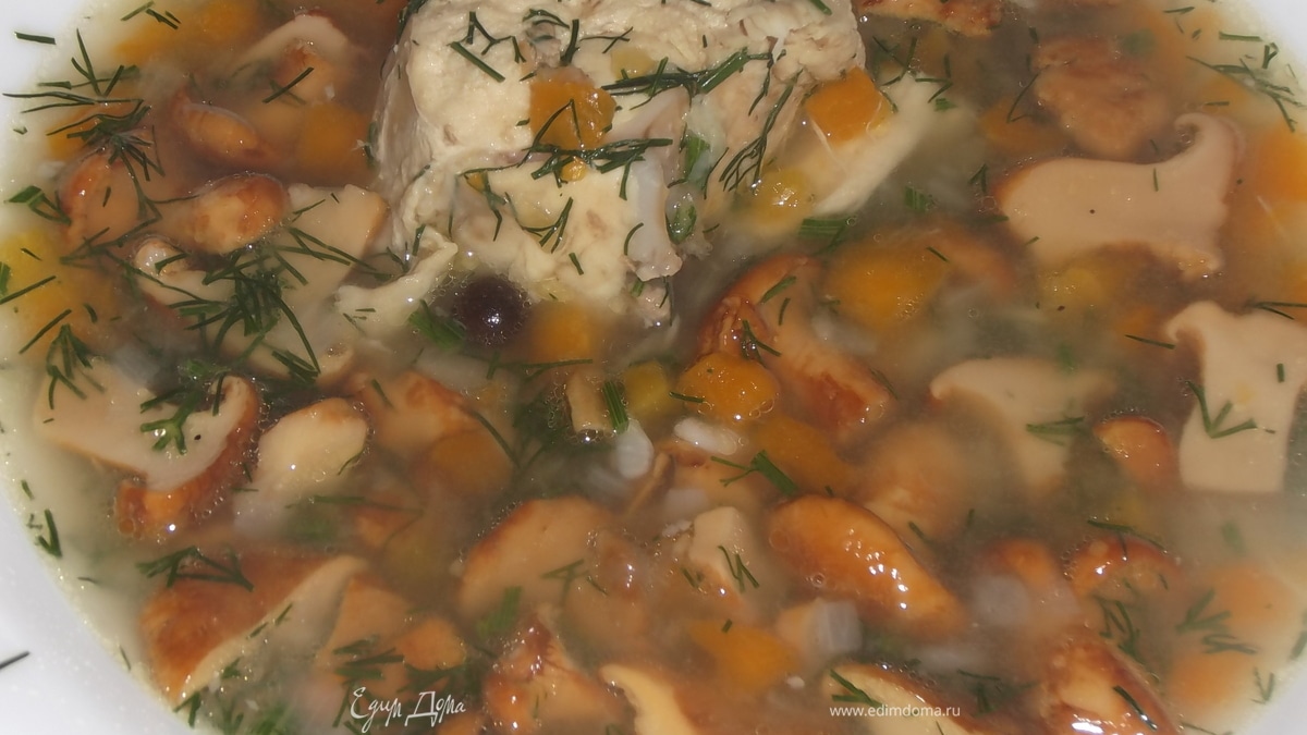Лисички с курицей в бульоне