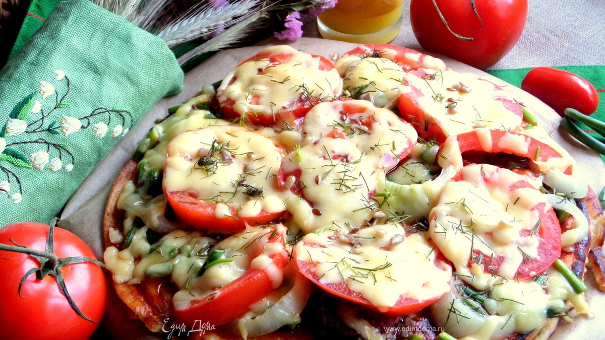 Дачный вариант обеда или ужина, когда духовка отсутствует или просто не хочется включать ее в жару. Очень сытно получается. За рецепт спасибо Маше (Masha vet)! Добавила от себя чесночные стрелки, но можно любую зелень использовать. Диаметр — 20 см.