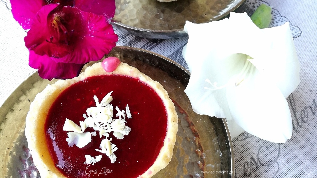 Оставшееся малиновое пюре смешать с агар-агаром (2 г) и разогреть, чтобы он полностью растворился. Остудить, но не пропустить момент, когда желе начнет загущаться. Покрыть тарталетки малиновым желе и так же отправить в холодильник минимум на 2 часа. - Шаг 11