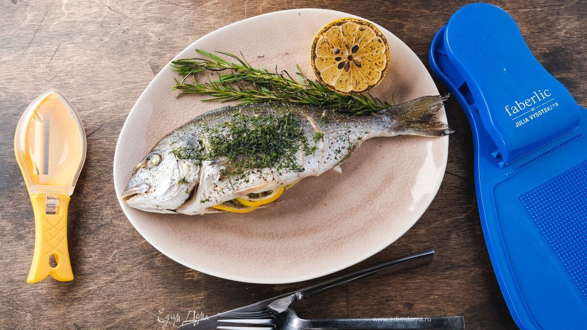 Дораду выпотрошите, удалите жабры. Положите на доску для рыбы с зажимом для хвоста Faberlic. Тугой зажим с острыми зубцами фиксирует хвост рыбы и позволяет значительно ускорить очистку чешуи. Почистите рыбу с помощью скребка для чистки рыбы Faberlic. Удобный скребок эргономичной формы значительно облегчит процесс чистки рыбы от чешуи, которая собирается в специальном контейнере и не разлетается в разные стороны, сохраняя порядок на рабочем месте на кухне. - Шаг 3