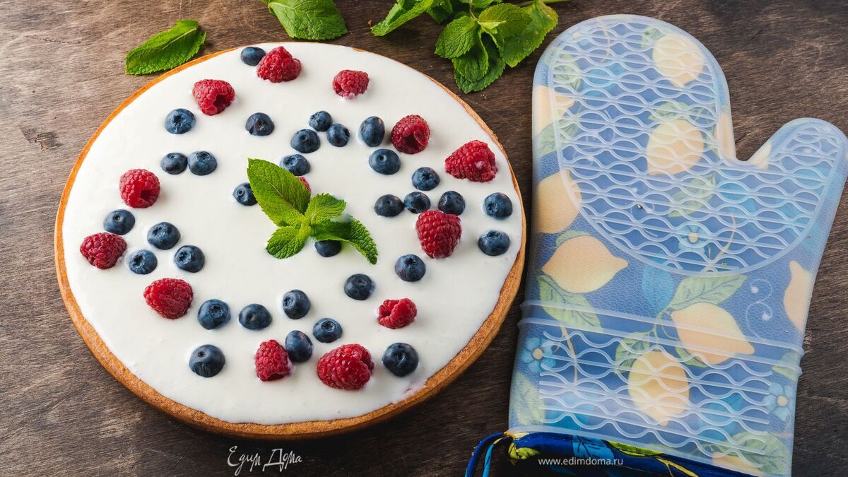 Выпекайте десерт при 170°С 1 час. Ориентируйтесь по своей духовке. Серединка запеканки должна немного подрагивать. Выключите духовку и оставьте запеканку еще на 30 минут. Тем временем приготовьте крем. Для этого взбейте сметану с сахарной пудрой. Украсьте запеканку сметанным кремом и свежими сезонными ягодами, листочками мяты. Приятного чаепития!