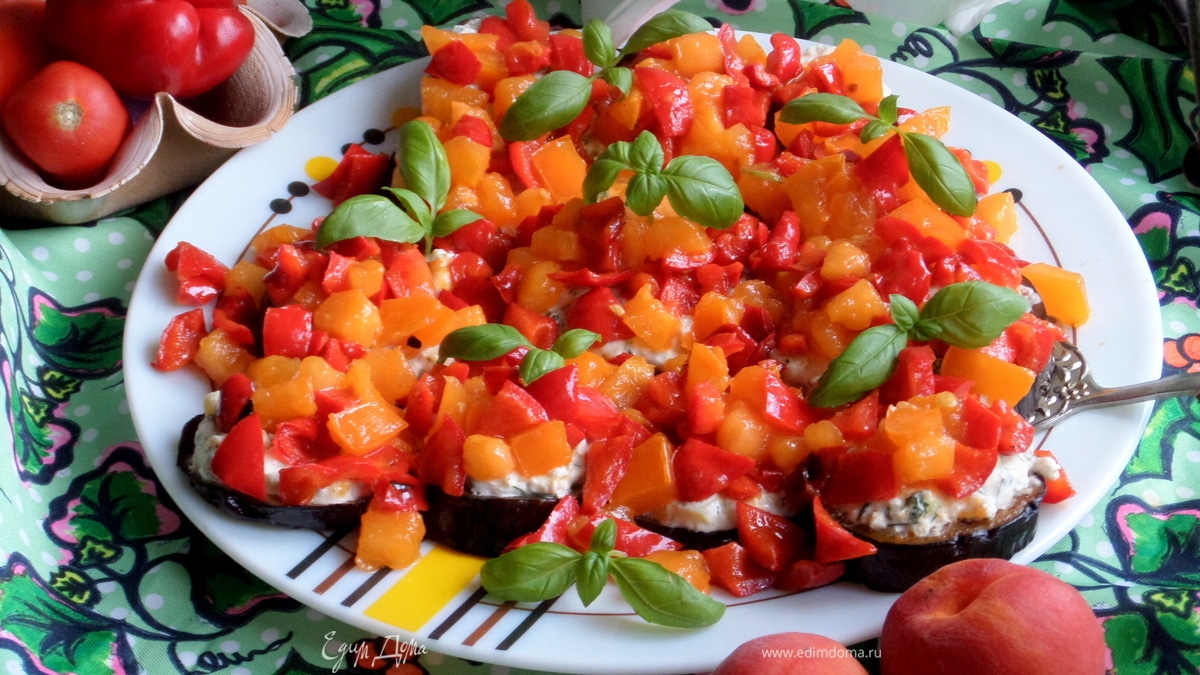 Думаю, вы согласитесь,что блюдо-закуска очень яркое и все благодаря сезонным овощам. За рецепт благодарю Марию из Германии, от себя добавила творог и сыр. В оригинале сверху были красные помидоры и желтый перец, у меня получилось наоборот: желтый большой помидор (угостили урожаем из села) и красный перец (накупила местных мелких). Вполне подходит для подачи гостям и можно приготовить с вечера. Для большой тарелки достаточно одного баклажана.