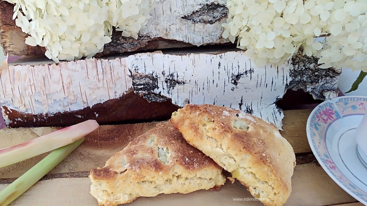 Самый быстрый вариант выпечки, когда нужно срочно что-то приготовить голодным детям на полдник. Вместо ревеня можно взять любую ягоду или нарезанные фрукты, но именно легкая кислинка этих витаминных стебельков тут к месту. Сконы получаются очень нежными!