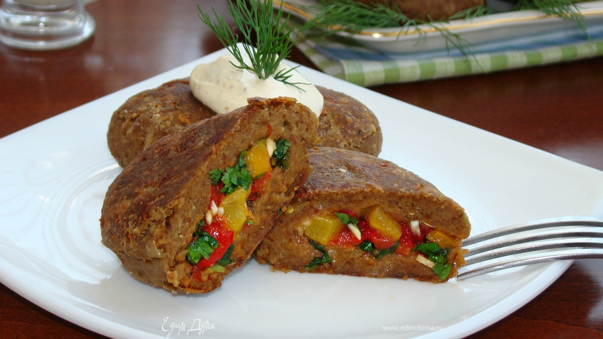 Баклажановый фарш разделить на 8 частей. Из каждой части сделать лепешку, положить в серединку начинку из перцев и сформировать котлетку. - Шаг 7