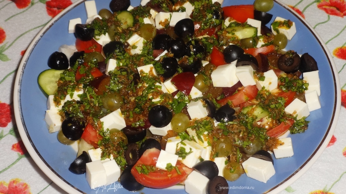 Овощной салат с фруктами, фетой и острой заправкой