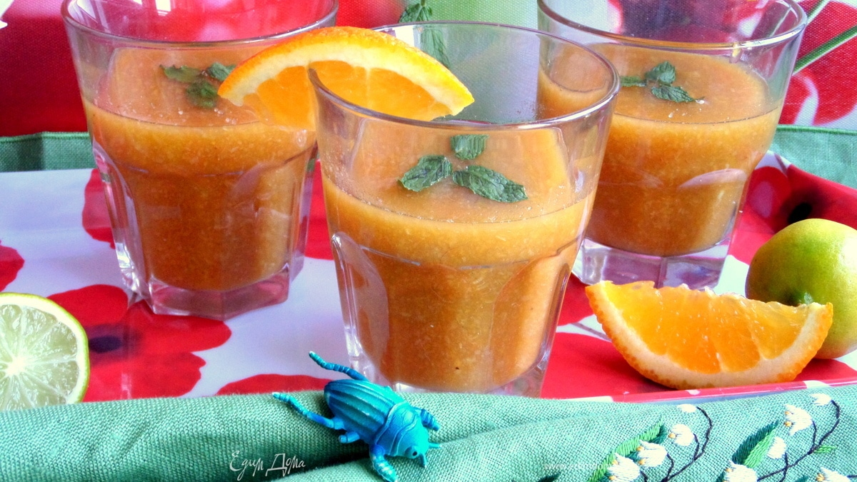 Такой необычный смузи привлек мое внимание, так как люблю и курагу, и имбирь, да и зеленый чай тоже. Идея принадлежит Оле (девочка с плеером). Я лишь побольше разбавила для удобного поглощения. И да, исключила перчик. Еще при подаче выжала немного апельсина для аромата.