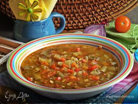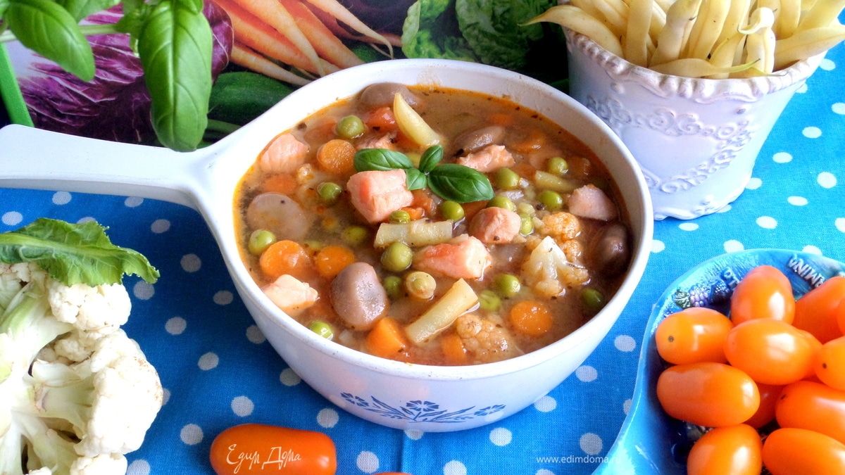 Спешу приготовить сборный супчик из сезонных овощей и бобовых. Также можно использовать замороженные овощи (часть я заморозила). Я добавила рыбу по своему вкусу, но можно сделать мясной вариант: с фрикадельками, сосисками или просто с фаршем обжаренным. В любом случае обед будет готов быстро.