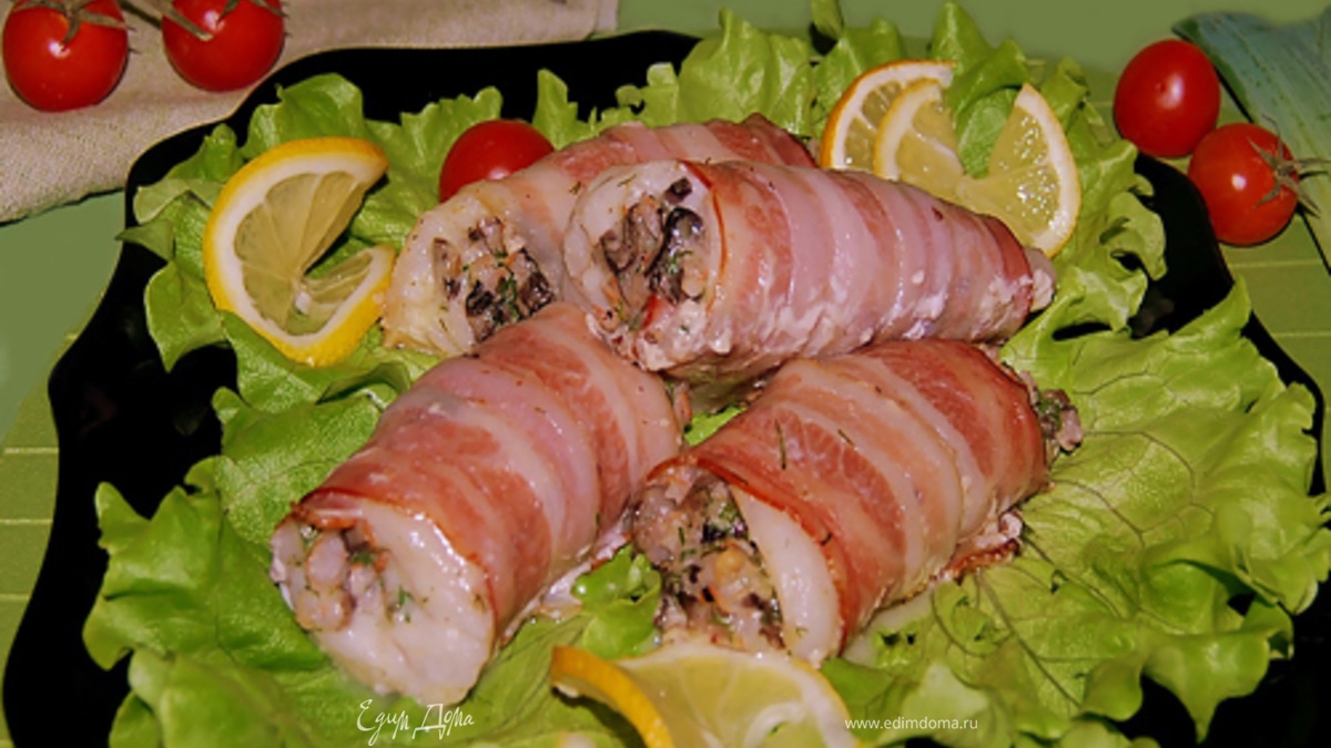 - Шаг 1Рыбное филе отбить (лучше через пищевую плёнку, посолить, приправить специями. Уложить на рыбное филе тертый сыр, нарезанные грибы, отварные резаные креветки, зелень. Свернуть в рулет, обернуть его полосками бекона. Запекать в духовке при 180-200°C, 15-20 минут. Приятного аппетита!