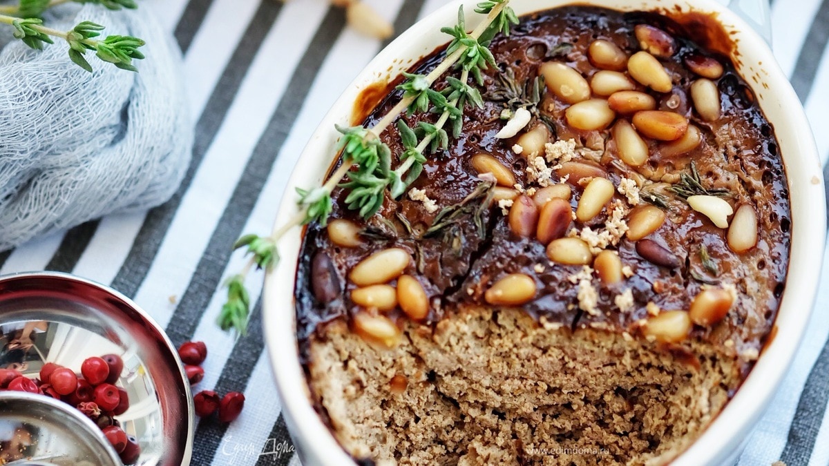 Разлить полученную массу по керамическим формам для запекания, посыпать кедровыми орешками и разложить листики тимьяна.