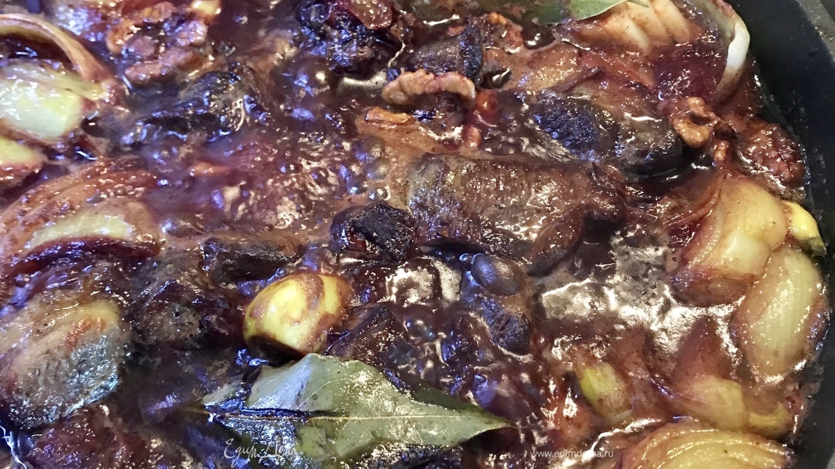 Всыпать в кастрюлю половину грецких орехов и продолжать томить мясо еще полчаса. Если жидкость выпарится, добавить бульона или воды.