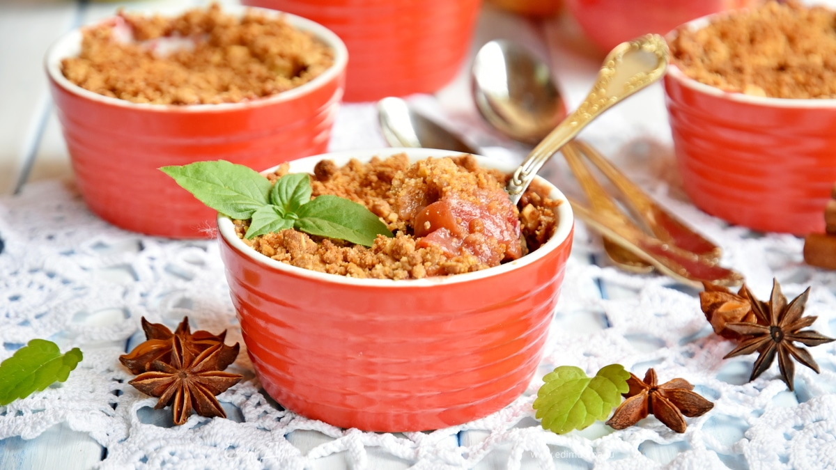 Классический английский десерт крамбл представляет собой запеченные фрукты, покрытые штрейзельной крошкой. Основой фруктового крамбла