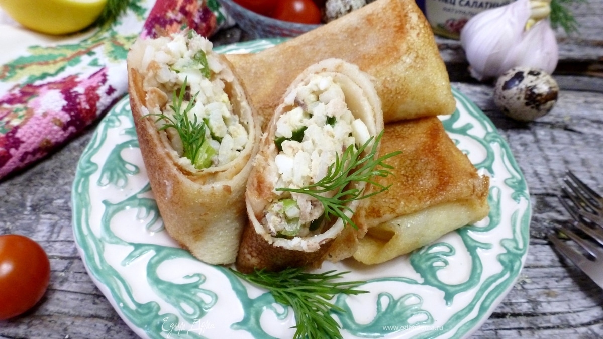 Блинчики готовим по своему любимому рецепту. У меня самый простой и облегченный (молоко я развела наполовину водой). Начинка из вареного риса, яйца, консервированного тунца ТМ «Магуро» и зеленого лука. Попробуйте, очень вкусно!