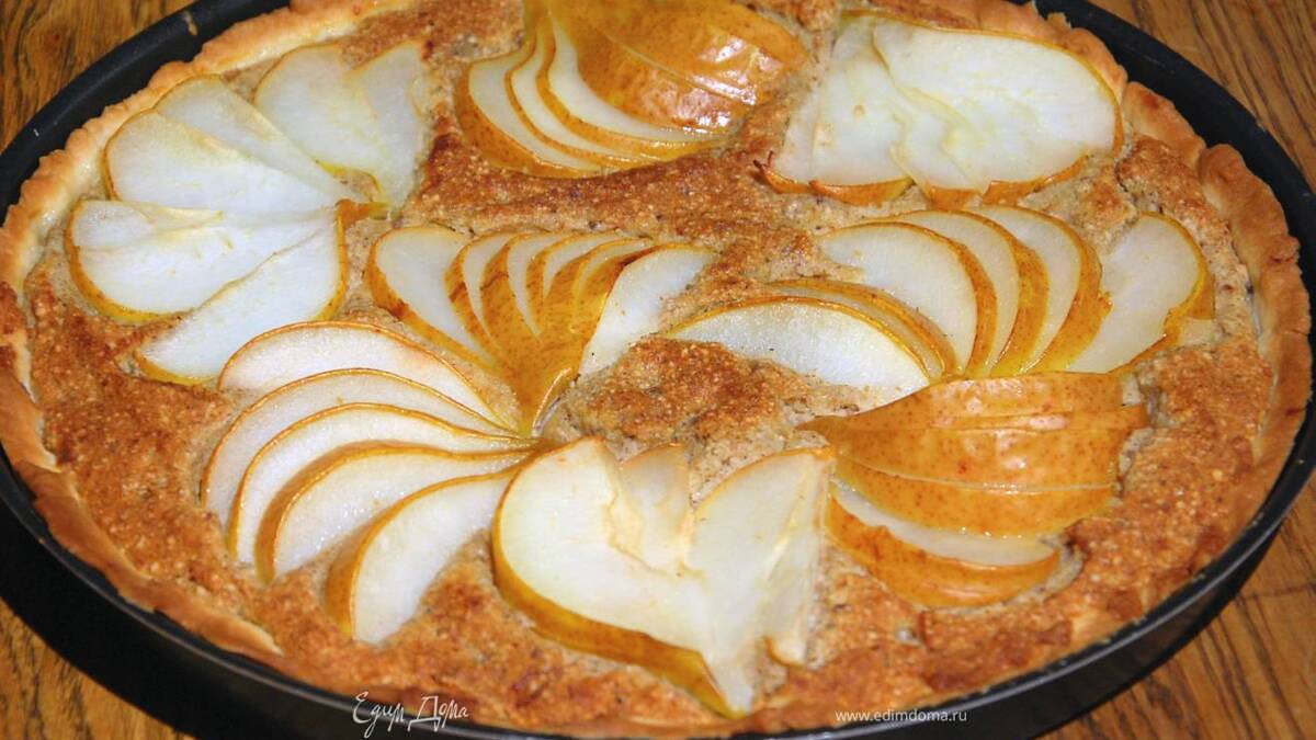 В форму с подмороженным тестом равномерно выложить марципановую пасту, сверху разложить груши. - Шаг 10