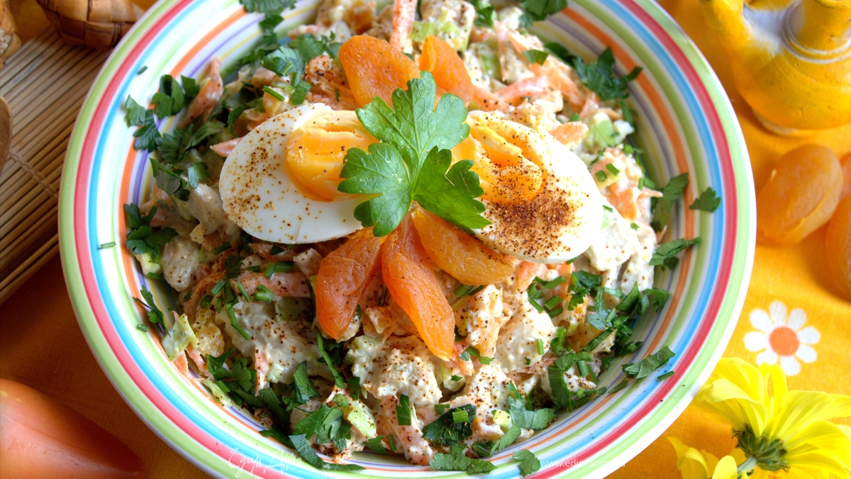 Никаких особых манипуляций не потребуется для данного салатика. При том курицу я заранее обжарила и держала в холодильнике для другого блюда, но вот увидела такой простой салатик у Люды (Сурик), за что благодарю! В оригинале использовалась вареная курятина и зеленый лук, я заменила на порей. От себя прибавила курагу, она просилась по составу и очень приятно попадалась на вилочку (можно и больше положить!). Внесла свои приправы в заправку. Таким салатиком можно и поужинать, обязательно буду повторять, это так просто!