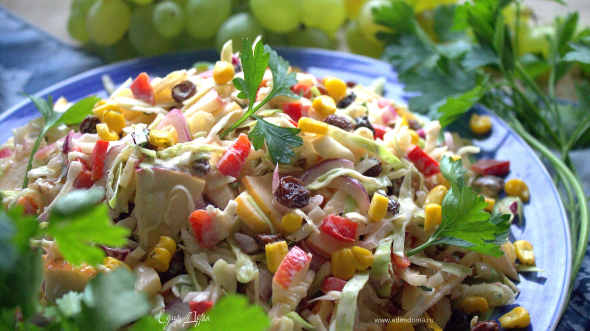 По мотивам салата «Коул-слоу», который в оригинале заправляется майонезом. Мое название придумалось во время дегустации, так значится он и в папках, лучше не придумала, поэтому оставляю! Даже на второй день салат остается хрустящим, только перед подачей его желательно перемешать. Примерно такой салат увидела у Лили (Лепачка), только у нее еще красная капуста была. По желанию добавьте морковку, но мне захотелось, чтобы мелькал перчик. Яблоко у меня было сладкое сочное, а изюм смело добавляйте, я не первый раз готовлю с ним капустные салатики.