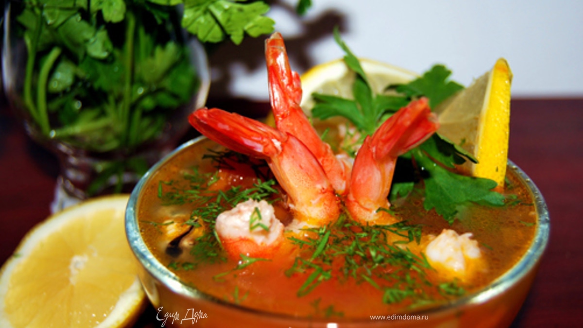 - Шаг 1Обжарить мелко нашинкованный лук, добавить туда томаты (очищенные от шкурки /для этого надо сначала обдать кипятком/) немного потушить и добавить чеснок. В кастрюлю с кипящей водой положить нарезанную морковь, мидии, горошек(промытый под холодной водой). Затем в кастрюлю добавить спасерованный лук, помидоры и чеснок. Довести до кипения. Очищенные креветки добавить в уже готовый суп(чтобы креветки не стали жесткими варить их не надо). Дать настояться. Подавать к столу с зеленью - лучше с укропом. Для пикантности добавить лимон. Приятного аппетита!