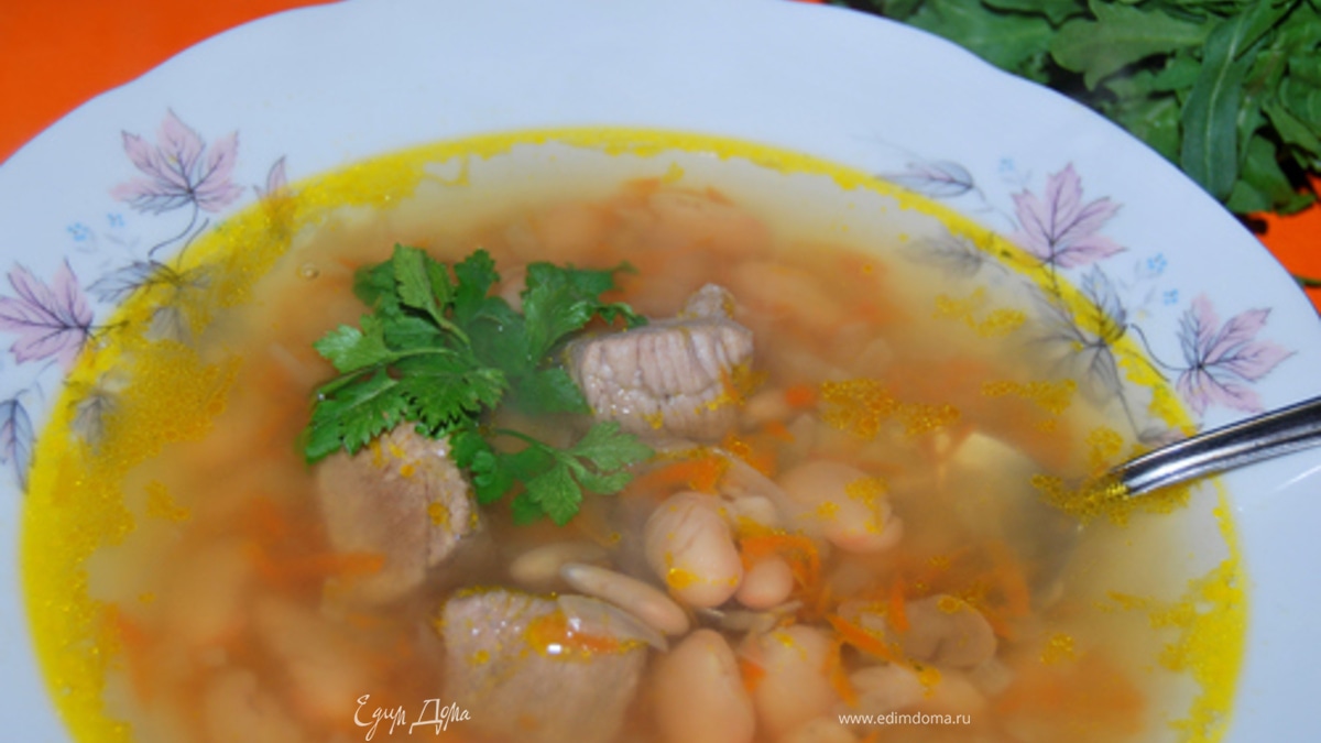 - Шаг 1Отвариваем любое мясо на Ваше усмотрение. Обжариваем лук, морковь. Добавляем в кастрюлю с бульоном: лук, морковь, фасоль консервированную и сок от нее и доводим всё до готовности. Приятного аппетита!