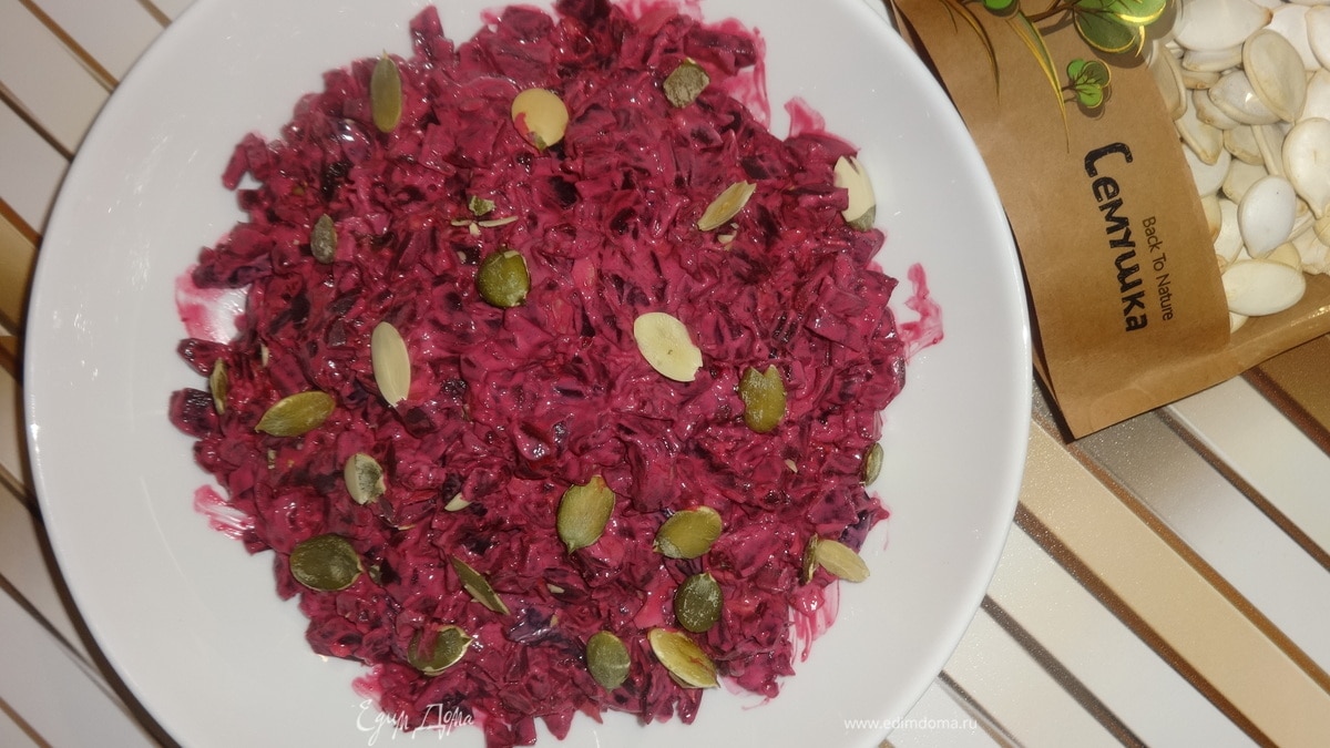 Выложить салат в тарелку, украсить целыми тыквенными семечками. Подать к столу. Угощайтесь! Приятного аппетита!