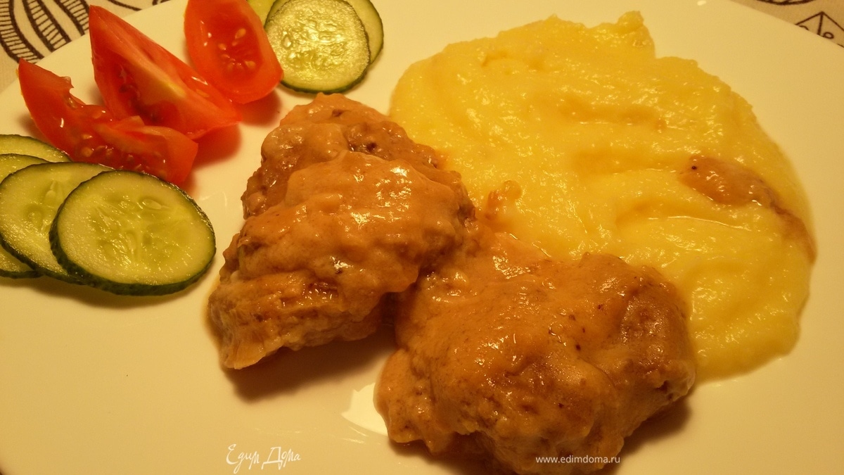 К луку добавить муку и немного обжарить. Влить сметану и бульон. Размешать полученный соус, чтобы в нем не было комков. Посолить по вкусу. Положить в сметанный соус печень и тушить на слабом огне 30 минут. Подавать с картофельным пюре или рисом.