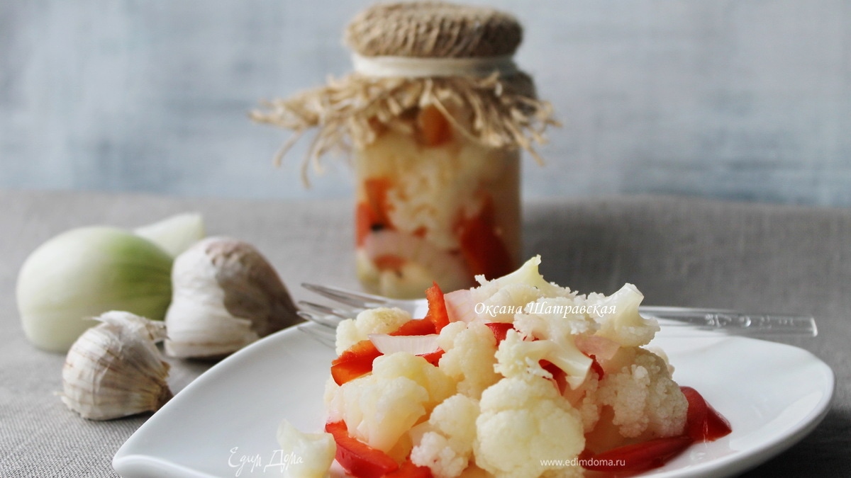 Предлагаю вашему вниманию вкусный салатик из цветной капусты. Капуста получается хрустящей, а сладкий перец и лук прекрасно сочетаются с ней.